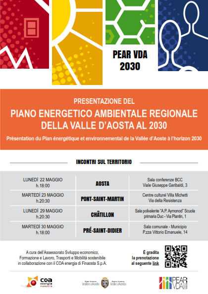 I giorni 29 maggio a Chatillon (h20:30) e 30 maggio a Pré-Saint-Didier (h18:00), sarà presentato il Piano Energetico Ambientale regionale della Valle d’Aosta 2030.