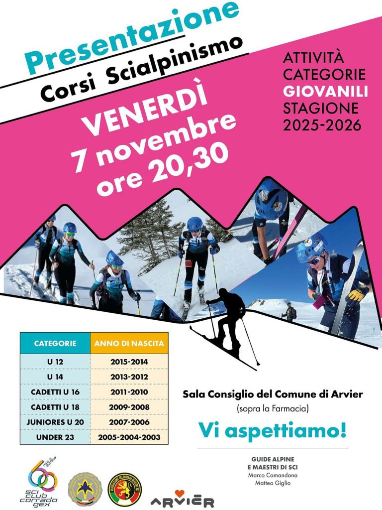 Anche quest’anno lo Sci Club Corrado Gex organizza i corsi di Scialpinismo. Vi invitiamo a partecipare alla serata di presentazione che si terrà presso la Sala Consiliare del Comune di Arvier il prossimo 7 novembre alle ore 20:30.