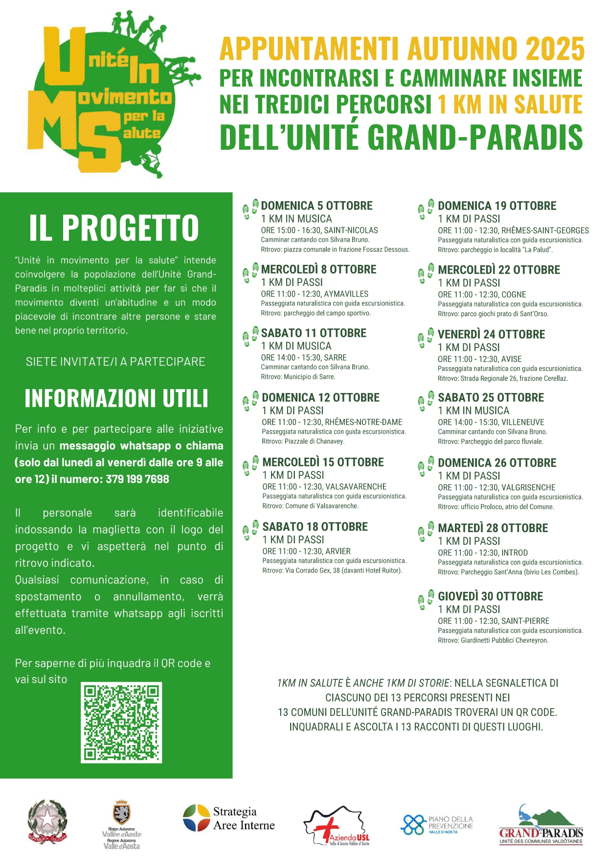 Appuntamenti Autunno 2025 per incontrarsi e camminare insieme nei tredici percorsi 1 Km in salute dell’Unité Grand-Paradis.